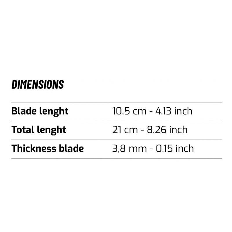 Lâmina de seção hexagonal para grande resistência à flexão e quebra. Um lado com borda lisa e outro com borda serrilhada. A lâmina se estende para dentro do cabo para dar rigidez estrutural ao conjuntoAço maraging EN W 1.14116. A melhor relação de dureza (HRC 55/56) - . Este aço permite excelente duração da capacidade de corte e é extremamente resistente tanto à flexão quanto à fratura.